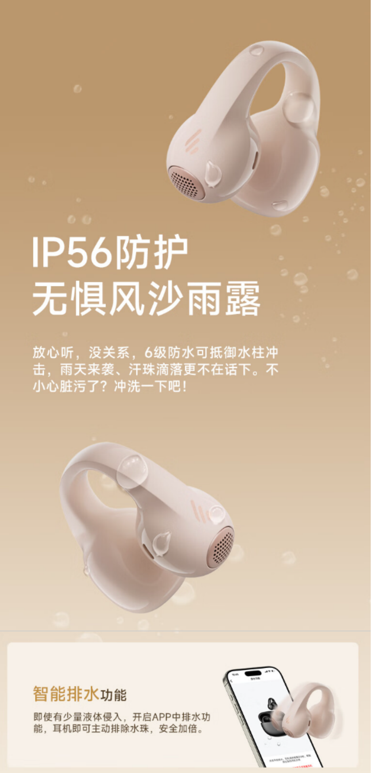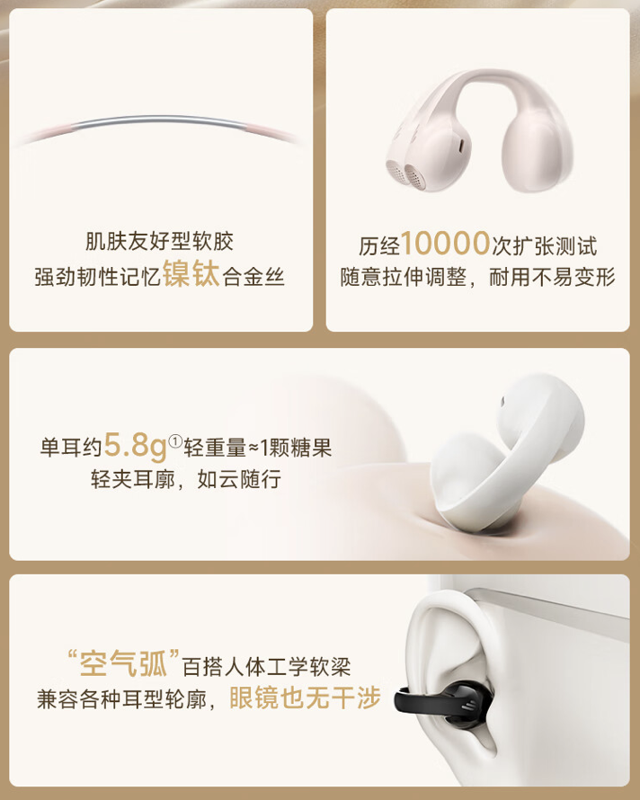 据介绍,漫步者 Comfo Clip 可选“夜光黑”“珠光白”两种配色,单耳重量约 5.8g,支持 IP56 抗水防溅,采用“肌肤友好型软胶”及“强劲韧性记忆镍钛合金丝”,配备“空气弧”人体工学软梁,可随意拉伸调整,耐用不易变形。