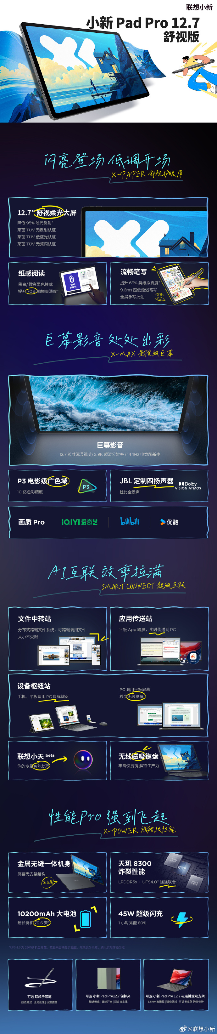 除了强劲性能和全天续航外,全新小新Pad Pro 12.7的超清大屏同样可圈可点。其搭载12.7英寸LCD大屏,在2.9K分辨率、144Hz高刷新率、DCI-P3广色域和10Bit色深等加持下,配上JBL定制四扬声器和杜比视界,以及无论是视频会议还是影音娱乐,都能带来身临其境的沉浸视听感受。更有色温自适应及DC调光功能,有效缓解长时间使用带来的眼睛疲劳。