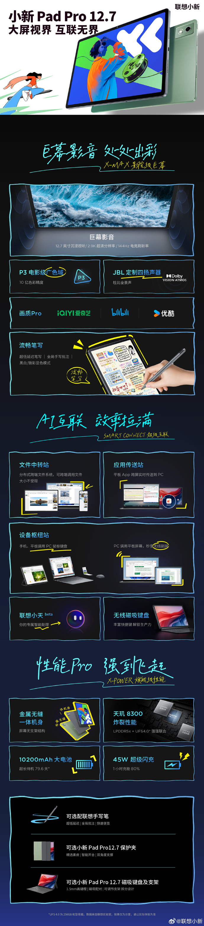 配置方面,全新小新Pad Pro 12.7平板有着天玑8300处理器、LPDDR 5X内存和UFS 4.0闪存组成黄金性能三角,安兔兔V10跑分达134万分。确保在办公和学习场景中,从文档处理到多任务交互一切响应迅速、流畅,而对于游戏玩家来说,满帧游戏体验无压力,配合内置的10200mAh超大电池,持久续航加持下一直玩一直爽,更具备79.6天待机时间和45W快充,差旅途中也不会感到续航焦虑。