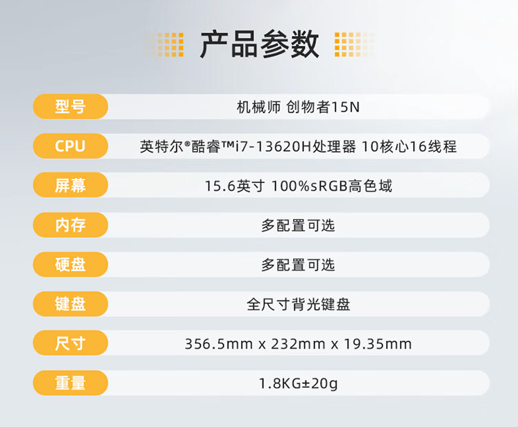 机械师这边带来新款创物者15N笔记本电脑,定位“大屏高性能轻薄本”,主打商务办公。现已上架开启预售,搭载酷睿i7-13620H处理器,首发价3499元起,感兴趣可关注。