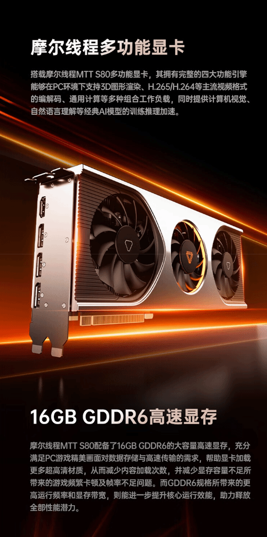 官方称“该显卡能够在PC环境下支持3D图形渲染、H.265/H.264等主流视频格式的编解码、通用计算等多种组合工作负载,同时提供计算机视觉、自然语言理解等经典AI模型的训练推理加速”。