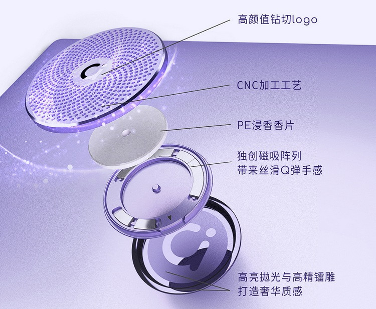 亮点是A面外壳LOGO区域还有个香片匣,用料和工艺也很好,采用CNC工艺,内置PE浸香香片,磁吸式固定。