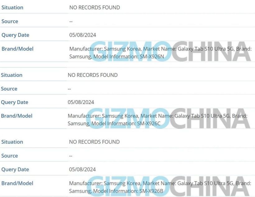 科技媒体 GizmoChina 挖掘 GSMA IMEI 数据库,表示最早在 6 个月前,就在数据库中发现 Galaxy Tab S10+ 和 Galaxy Tab S10 Ultra 两款机型踪迹,但没有发现标准版;截至 8 月 5 日,依然没有发现标准版 Galaxy Tab S10 的踪迹。