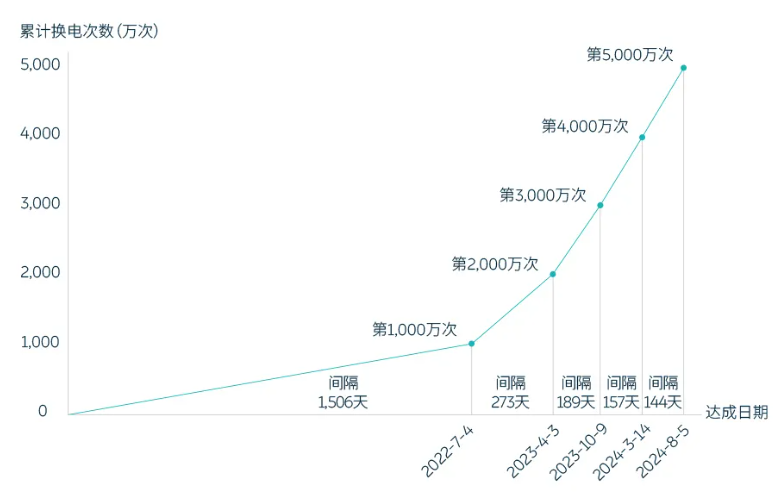注意到,蔚来换电突破 5000 万次,距离 4000 万次间隔了 144 天,整体速度不断加快。