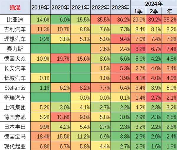 到2024年,比亚迪的插电式混合动力车市场份额保持在35.2%,其中,第二季度更是高达39.2%,凸显了其在插电式混合动力市场的领军地位。