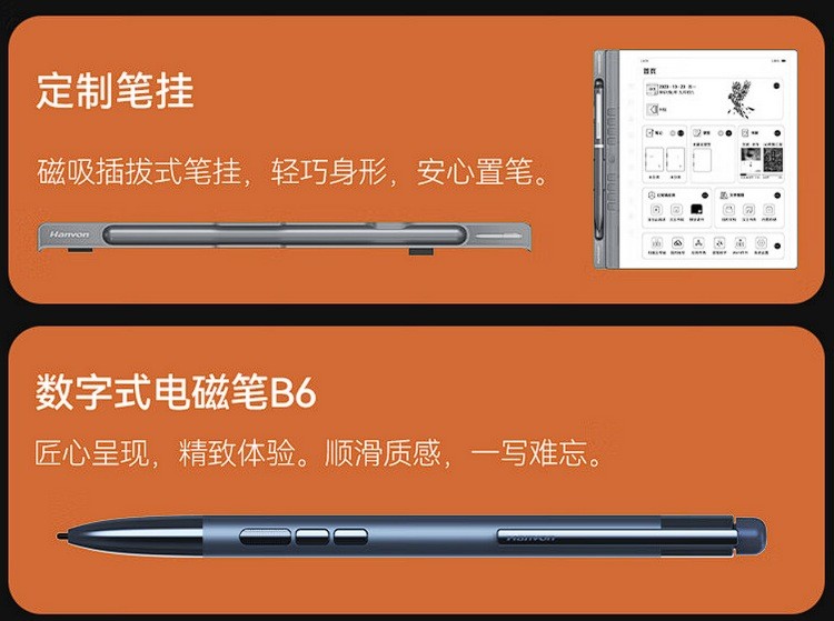 配件方面,除磁吸插拔保护套,还提供数字电磁笔,精致细腻,还自带磁吸插拔式壁挂;手写笔支持 8192 级压感,有高灵敏度和精度,同时笔身有快捷按键,可实现功能快速切换,而且无需充电可连续使用。