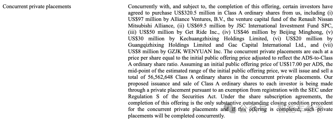 除了增发股份之外,文远知行还表示完成IPO的同时,还会以私募方式,出售价值3.205亿美元(折合人民币约为23亿元)的A类普通股。