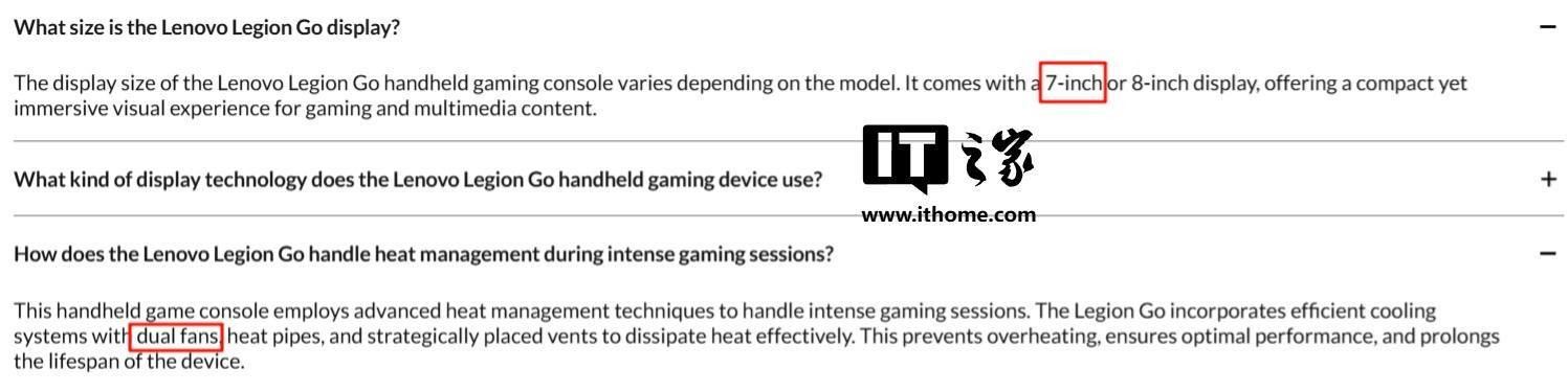 联想 Legion Go 英文官网的 FAQ 页面此前提到了一些未在现有联想 Legion Go 机型上出现的参数规格,比如 7 英寸屏幕、双风扇散热、HDMI 接口:
