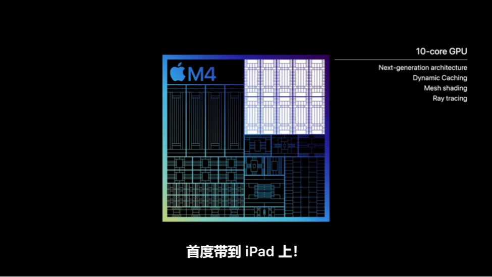 苹果 M4 芯片还搭载 10 核 GPU,相比 M2 速度提升 4 倍(渲染性能),首次为 iPad 带来动态缓存、硬件加速光线追踪和硬件加速网格着色功能;苹果 M4 还搭载 16 核神经网络引擎,运算速度达到每秒 38 万亿次,是 A11 芯片的 60 倍。
