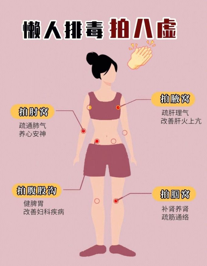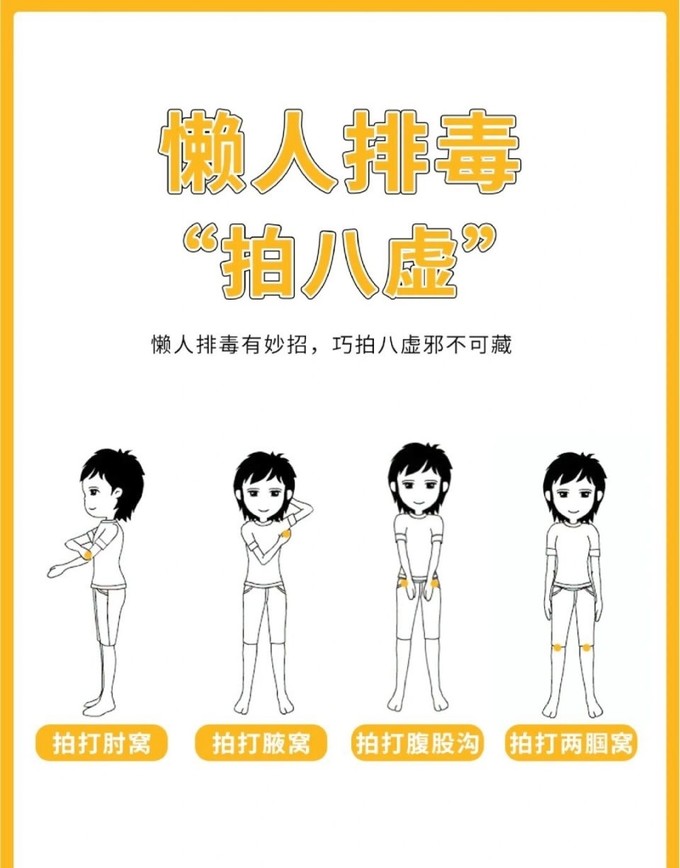 👏拍八虚的顺序:左肘窝-左腋窝-右肘窝-右腋窝-同时拍打髀窝(腹股沟)-同时拍打腘窝⭕