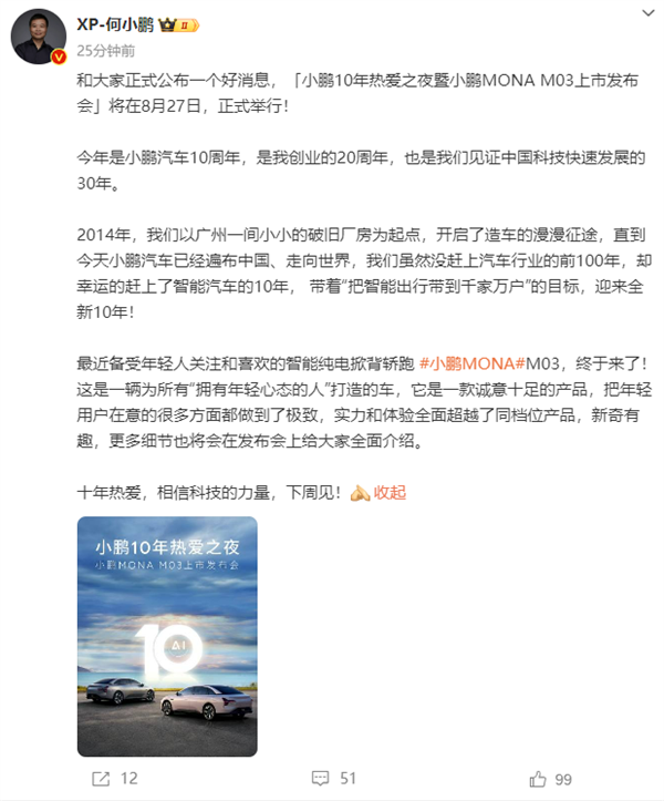 8月20日消息,小鹏汽车董事长何小鹏今日官宣,小鹏MONA M03上市发布会将于8月27日举行。