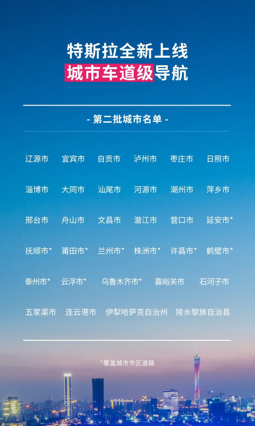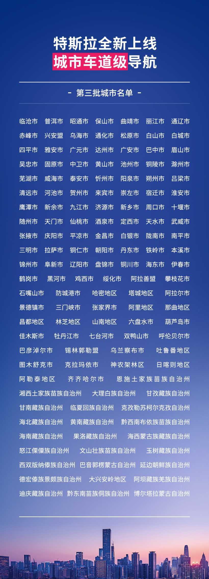 昨天特斯拉官方公布了第三批开放城市名单,含拉萨、通辽、天水等城市,附名单如下: