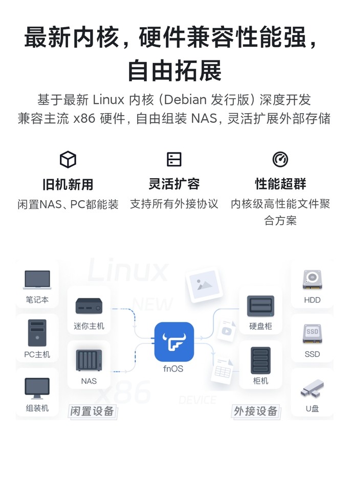 fnOS内核基于debian,支持主流的x86架构设备,个人用户目前是免费使用。