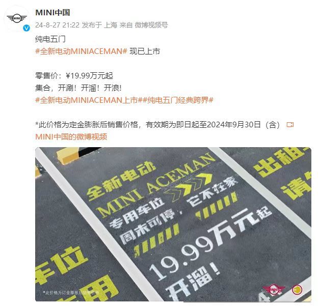 值得买官网消息 8月27日,MINI中国官方微博宣布,全新电动MINI ACEMAN现已上市,零售价19.99万元起,此价格为定金膨胀后销售价格,有效期为即日起至2024年9月30日(含)。