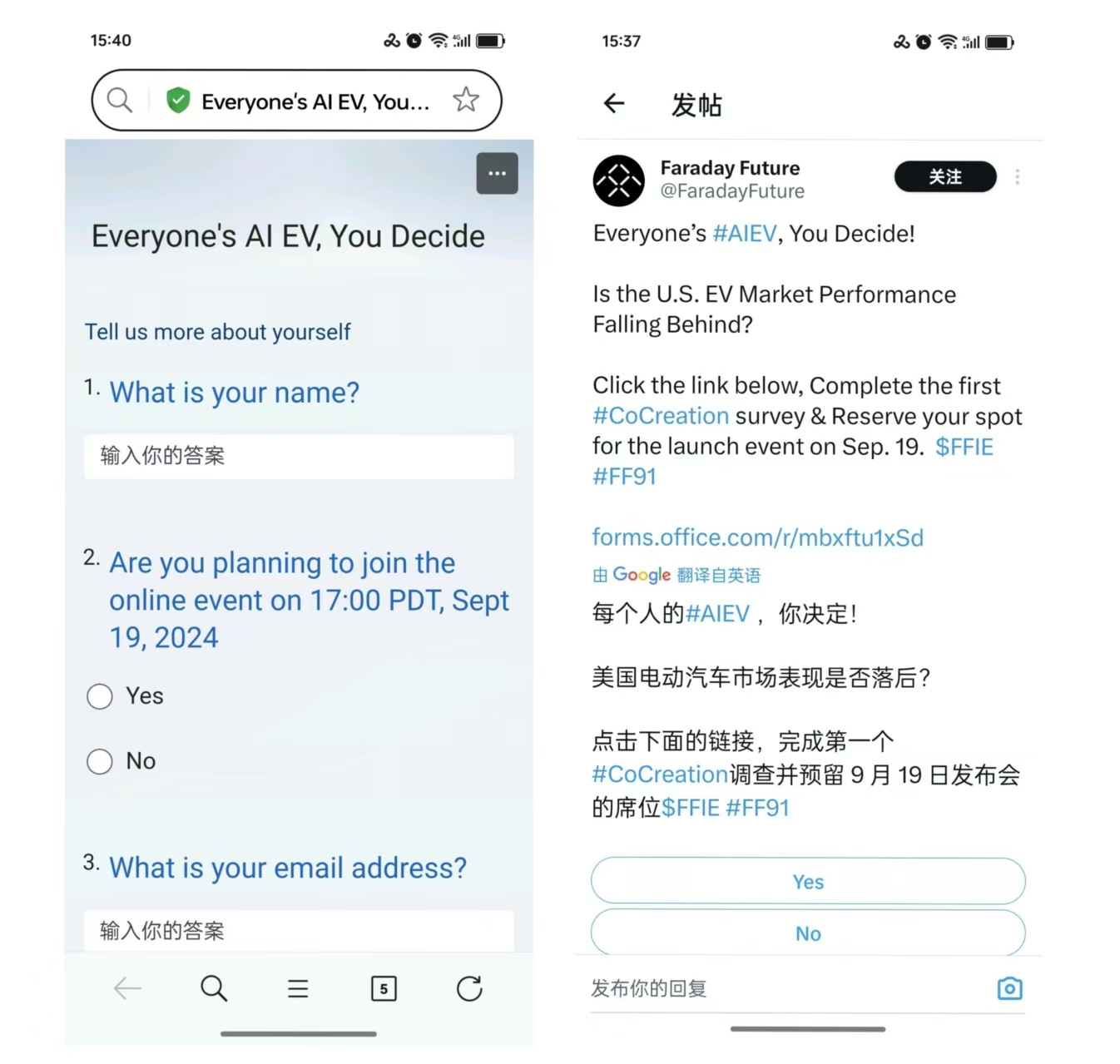 比较尴尬的一件事是,FF官方在X平台发布的调查问卷动态,评论区的互动几乎为0,点开他们的调查问卷链接,更像是对用户的基础背调,猜测是9月19日发布会的报名,而不是关于“美国人第一辆AI EV”的调研。