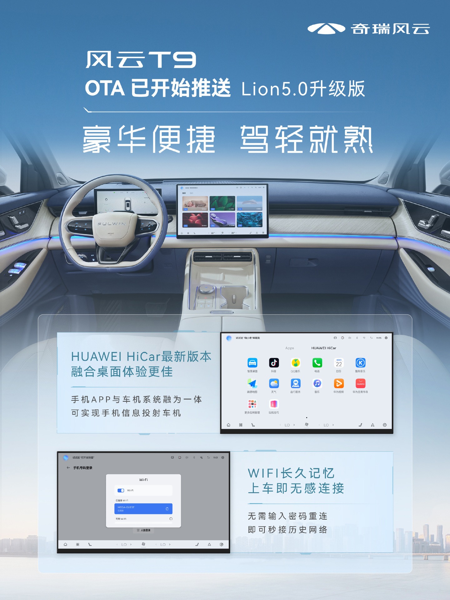 9 月 8 日消息,据奇瑞官方消息,风云 T9 已开始 OTA 推送 Lion5.0 升级版,总时长约 60 分钟。汇总主要升级内容如下: