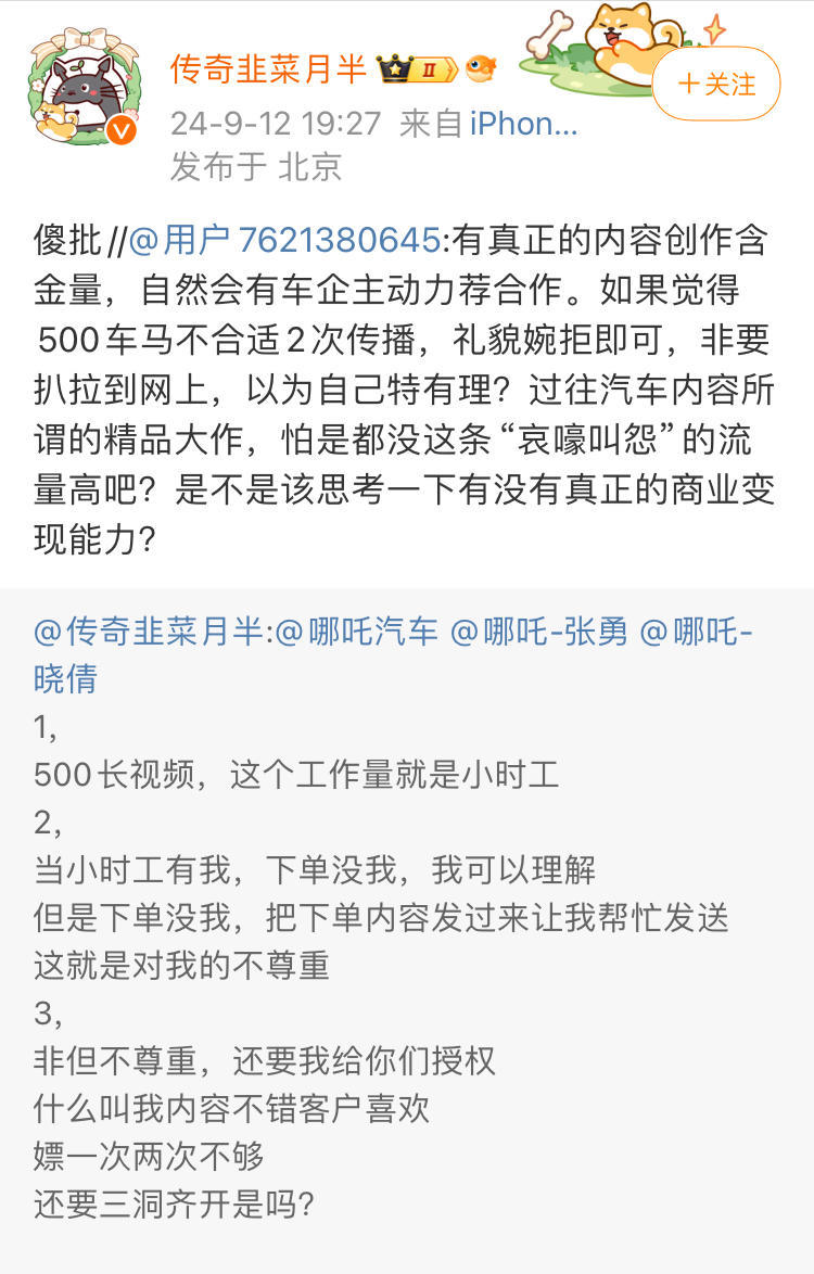 三言科技9月12日消息,今日,汽车博主“传奇韭菜月半”发微博吐槽称自己遭到哪吒汽车“白嫖”。