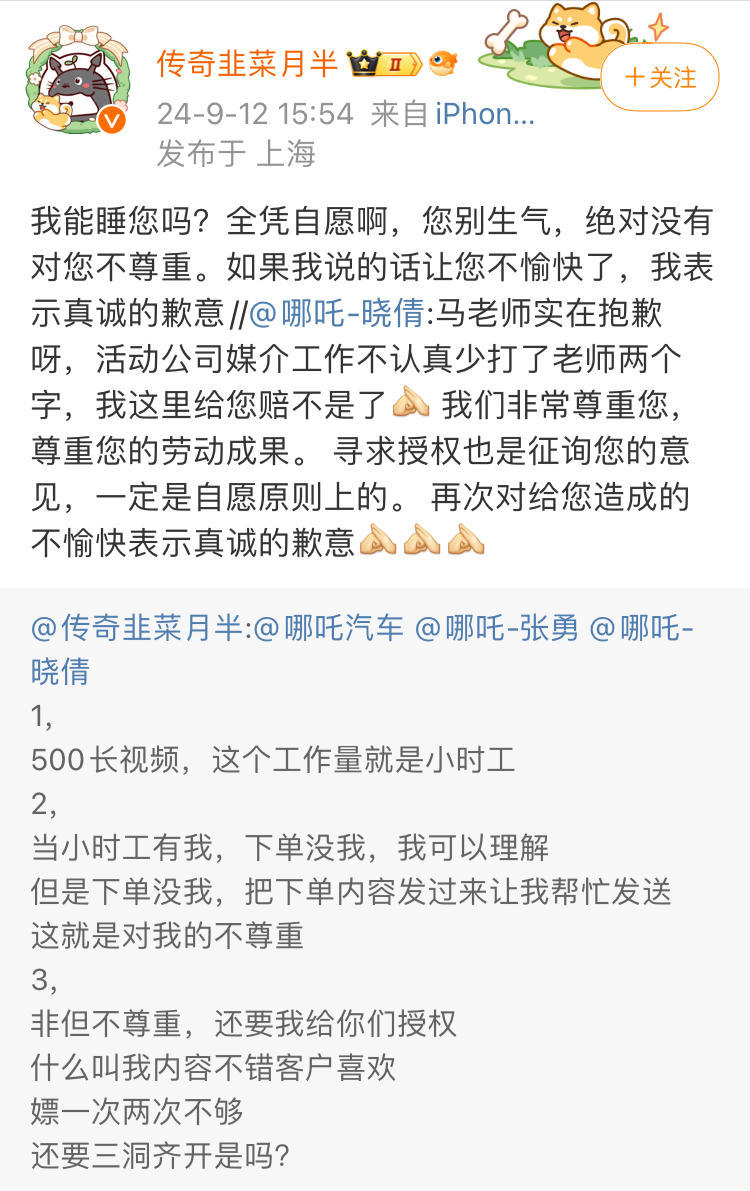 之后,“传奇韭菜月半”认为只有500元车马费,且“微博下单时没我,干活有我,狗都不能这么使唤吧”。他还质疑哪吒方面设立草根创业者人设,拿了百亿融资储备雄厚,但是私下尽是“白嫖和骚操作”。如果觉得自己内容不错,可以花钱买。