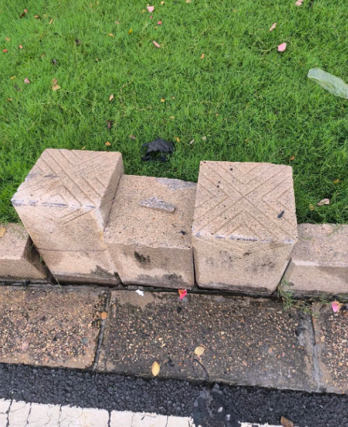 车辆前杠和底盘区域撞上隔离带周边的连续方形石块(约28cm*30cm*50cm)。