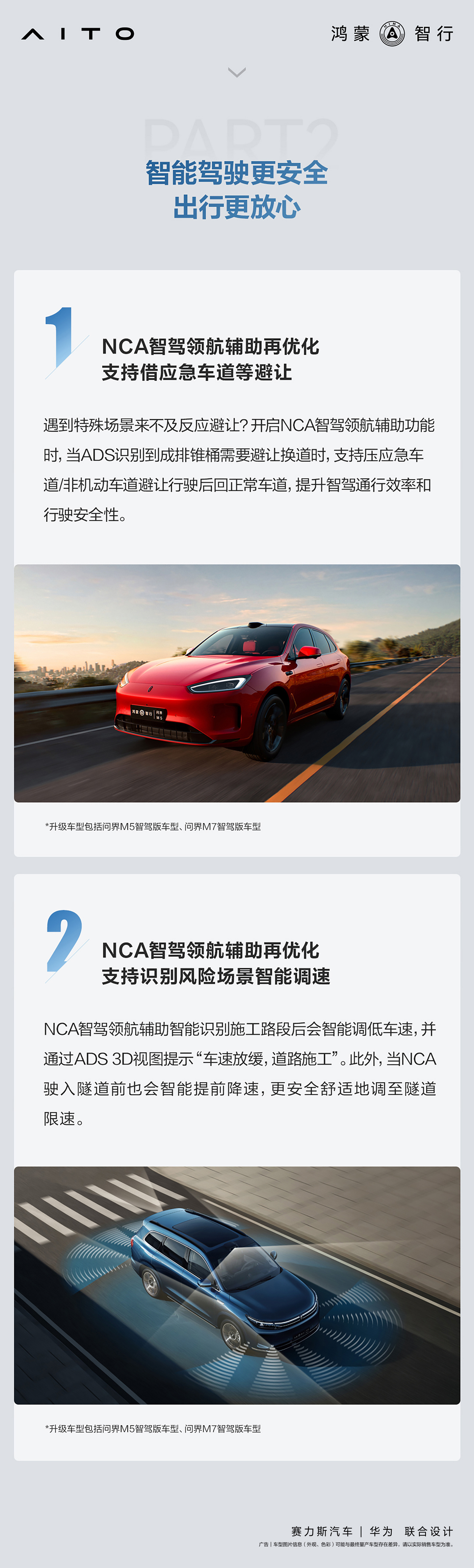 NCA,支持识别风险场景智能调速(升级车型包括问界 M5 智驾版车型、M7 智驾版车型)