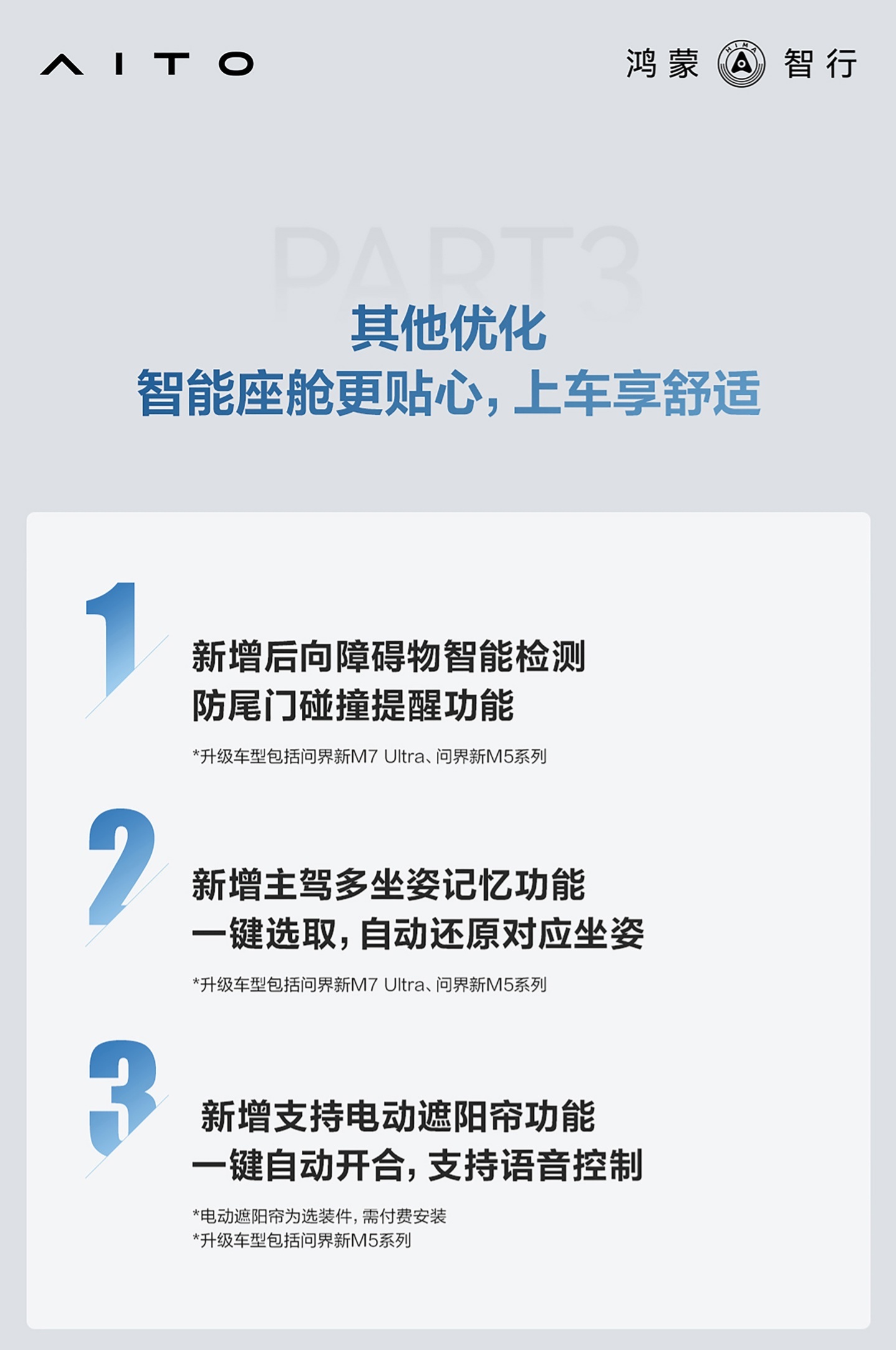 新增主驾多坐姿记忆功能(升级车型包括问界新 M7 Ultra、问界新 M5 系列)