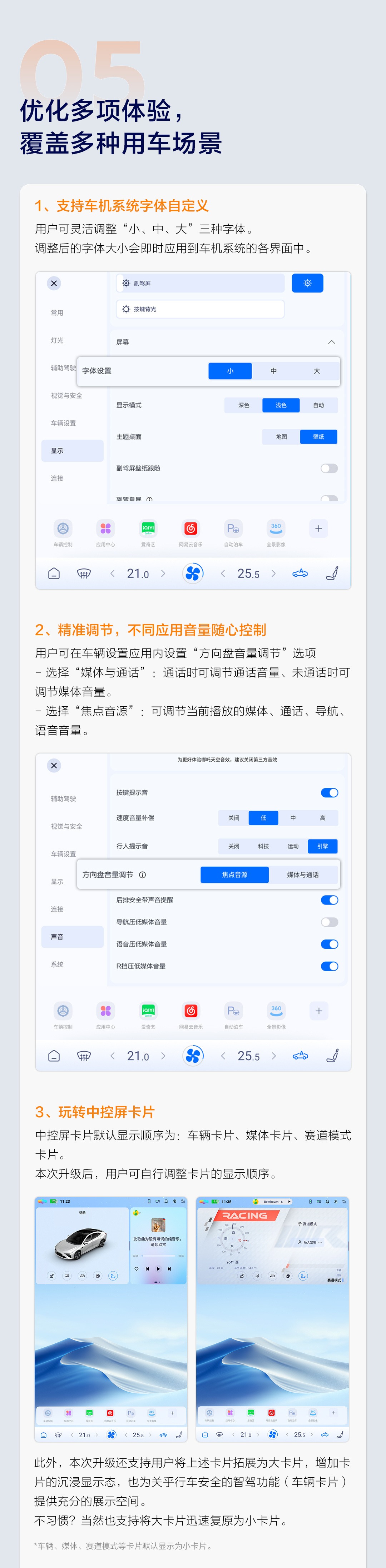支持车机系统字体自定义,用户可调整“小、中、大”三种字体,调整后的字体大小会应用在系统各界面