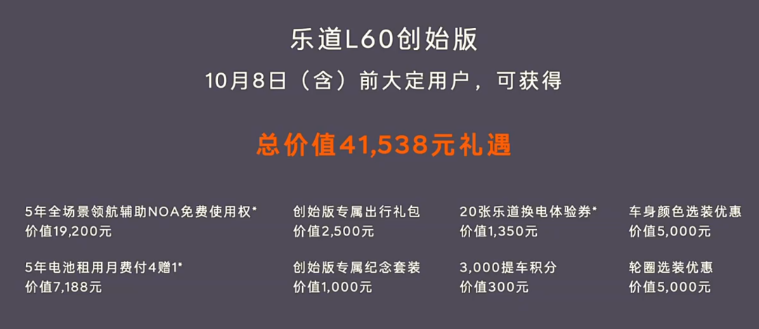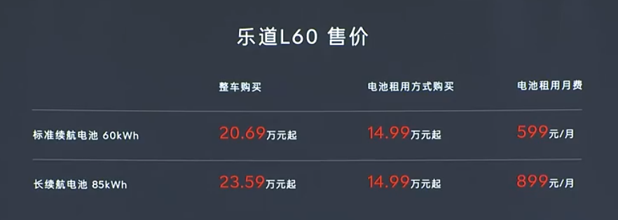 但我建议你这俩都别选,因为乐道和蔚来一样可以换电,也一样可以用 BAAS 电池租用的方式买车,这样 L60 的售价直接降到了 14.99 万。