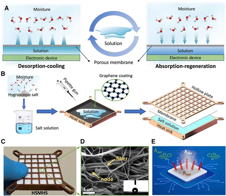 这种系统被称为「吸湿性含盐膜封装散热器」(HSMHS)。 该散热器采用标准散热器件,上面覆盖着一层充满溴化锂盐水溶液的多孔膜材料,这种膜可以让水蒸发。 电子元件通过解吸盐溶液进行散热—— 水蒸气通过多孔膜蒸发,从而从冷却组件中带走热量,散热过程中可以直接从空气中吸收水分来补充供水。 这样技术是由香港城市大学和武汉华中科技大学能源与动力工程学院共同研发。 使用这种新型的被动冷却技术,测试电脑系统的性能提升了32.65%。