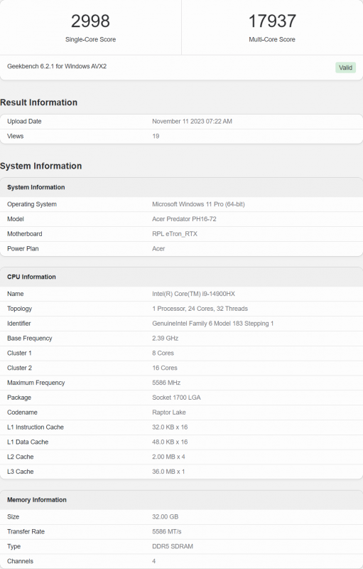 该CPU被发现运行在配备32GB DDR5-5600内存的ACER Predator PH16-72笔记本电脑中,14900HX实现了约5.8GHz的最高频率速度令人印象深刻。 几天前Intel Core i7-14700HX也在宏基笔记本电脑的同一数据库中泄漏。