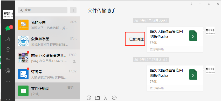 这时的结果是,微信是可以正常登录的,聊天记录也都是在的,微信接收的文件也都是在的,但是直接在微信窗口中双击打开接受的文件是无法正常打开的,会提示文件已被清理,其实文件存的,只是路径不对的。