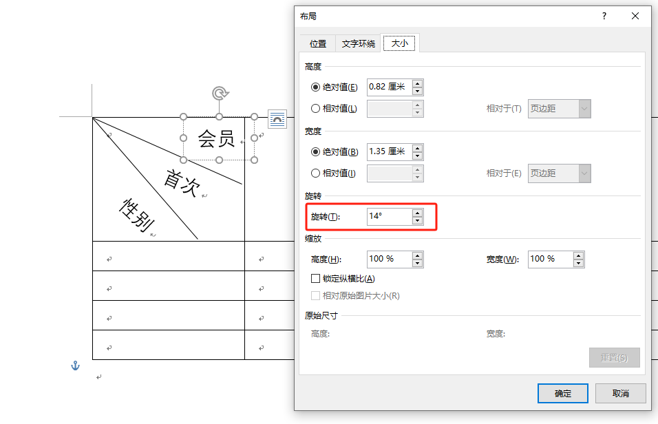 这时可以看到会员文本框,还是横着的,那如何将会员文本框的字,也斜着呢?这时选中“会员”文本,选择“布局选项”,找到“大小”选项,然后找再找到“旋转”,在这里可以调文字的角度。