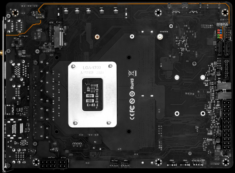 扩展插槽包括一个PCIe Gen 4.0 x16插槽、三个M.2(2x Gen4、2x Gen3)插槽和两个SATA 3接口。 PCB背面还有额外的M.2插槽,一个前面板USB接口以及两个风扇接口。