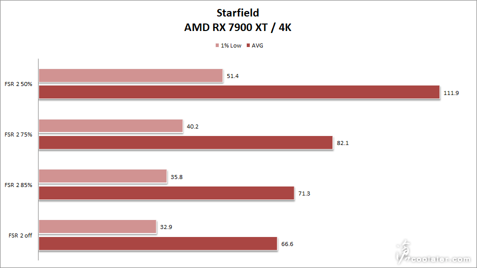 AMD RX 7900 XT 基本上在 4K 分辨率下画质全开到最高要顺跑《星空 Starfield》是没什么问题,即便不依赖 FSR 2 的功能,测试的 FPS 平均张大概在66张左右,1% Low 32.9张。 在直接套用最高画质时FSR 2功能是直接开启,而渲染分辨率比例会是75%,也会自动开启锐化功能,当然这边都是可以自行调整50~100%,不过个人觉得渲染分辨率比例75%算是刚好,毕竟个人电脑用的屏幕都不会过大,4K分辨率下是相当细致了,而最高画质FSR 2开启的效能RX 7900 XT平均张为82.1,相较于关闭FSR要提升23%左右, 是相当有感。