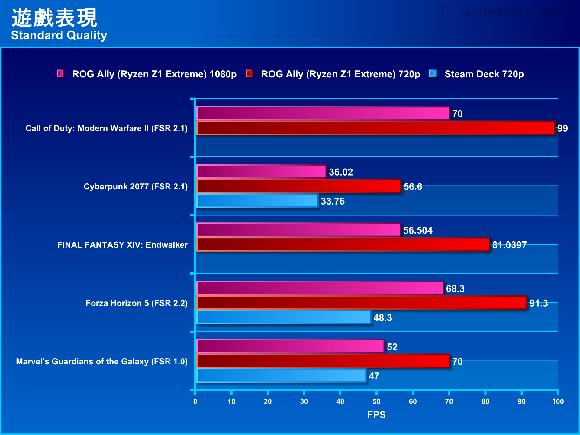 在720p分辨率环境、基础等特效的情况下,ROG Ally平均画面流畅度可以达到70 ~100 fps,效能大约是Seam Deck的1.5~1.9倍。