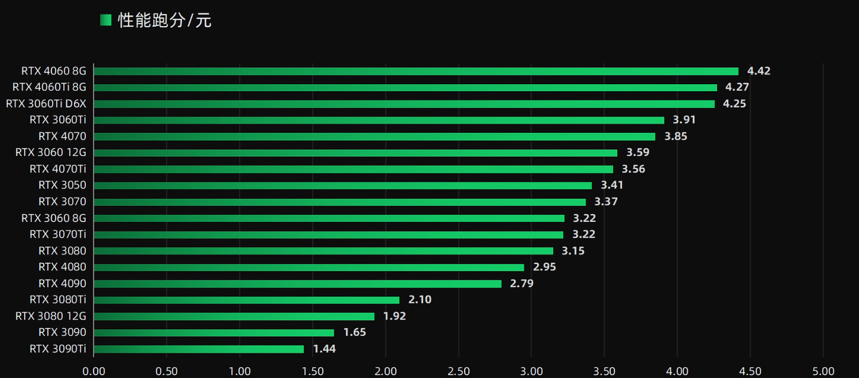 看起来性价比排第一是不是感觉还不错?但是现在矿潮过去了,而且30系显卡也快卖完了,到时候30系再降一波价,清完最后的库存,那么4060的性价比就显得没有那么高了。