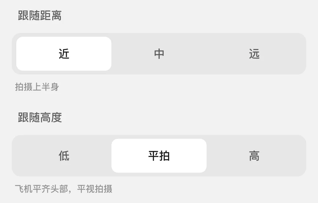 DJI Neo的“跟随拍摄”可以设置不同的距离和高度