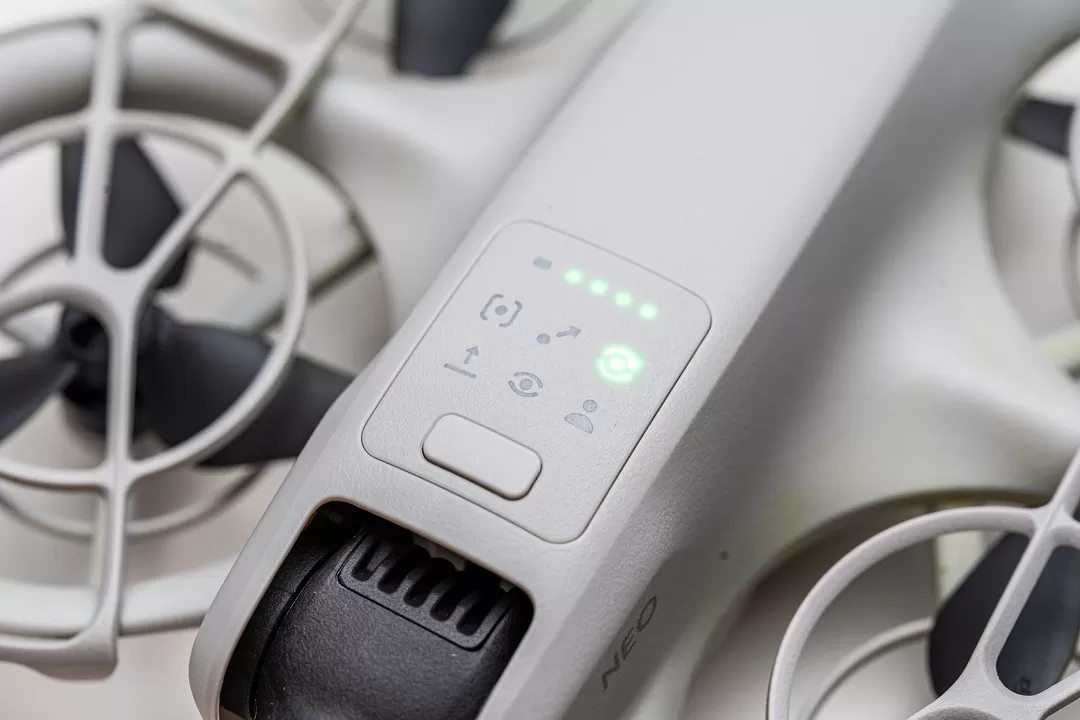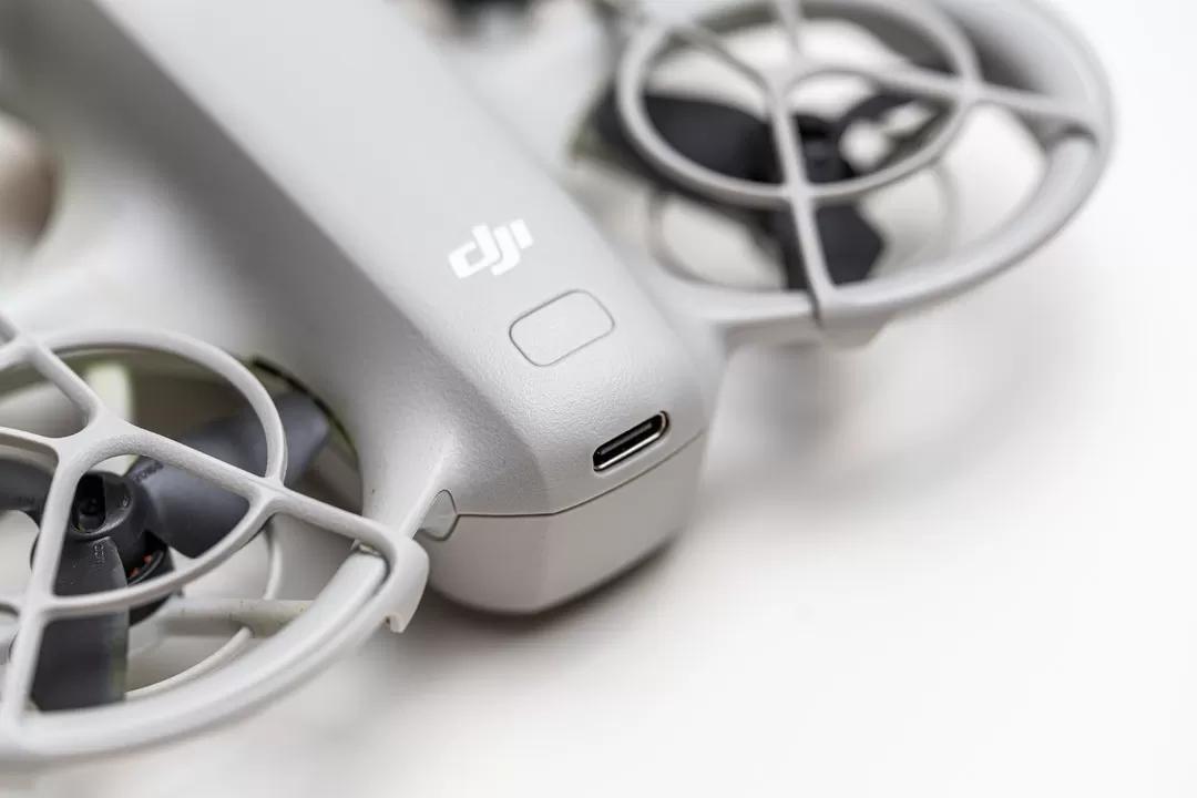 DJI Neo机身只有一个Type- C接口,直连机身充电的最大功率为15 瓦,从零电量到充满电大约需要50分钟。并且大家还需要注意的一点是这次DJI Neo并不支持存储卡,所有拍摄的素材通过内置的22GB存储空间保存。之所以取消存储卡插槽我想还是和这台无人机的定位有关,它还是希望面向入门用户,直接使用手机传输素材编辑更加方便。