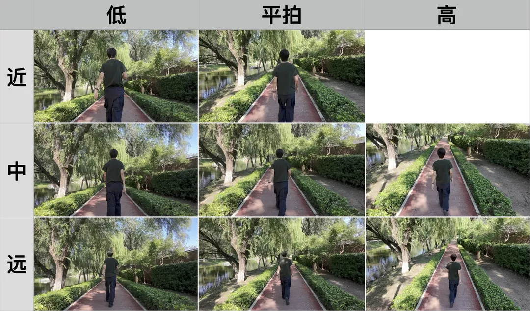我们实际测试了一下这九种拍摄角度对区别(其中近距离高角度素材丢失了……大家只能脑补一下),可以比较清楚的看出每种拍摄方式的视角还是有比较明显的差别的。用户可以根据拍摄环境的不同选择合适的拍摄角度,我最常用的其实还是远距离中或者高角度拍摄,这样可以比较完整的拍摄下我的全部身体。