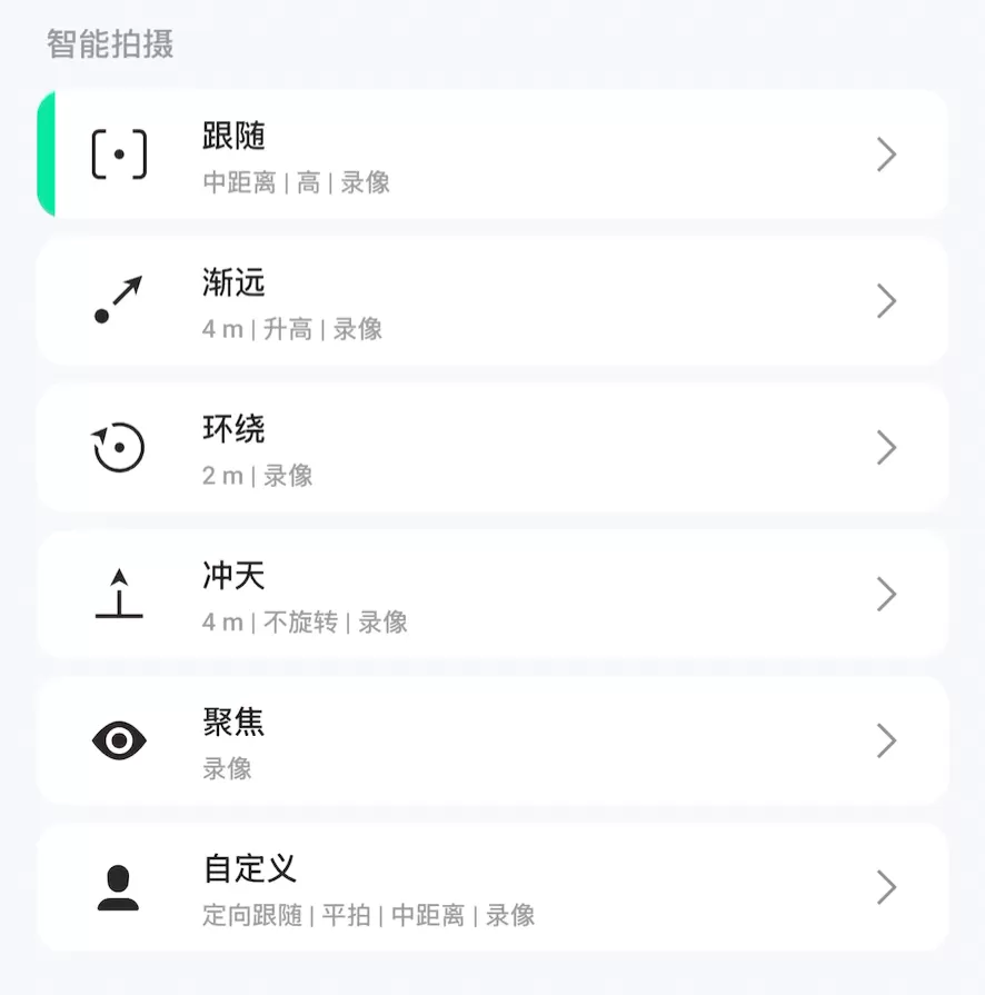 之所以我们称DJI Neo为最适合新手的无人机,主要原因就是它的智能拍摄系统。DJI Neo内置了6种智能拍摄模式,其中包括了自动跟随以及常规航拍无人机中的渐远、环绕、冲天、聚焦几个“一键短片”效果,最后一个则是自定义跟随模式。