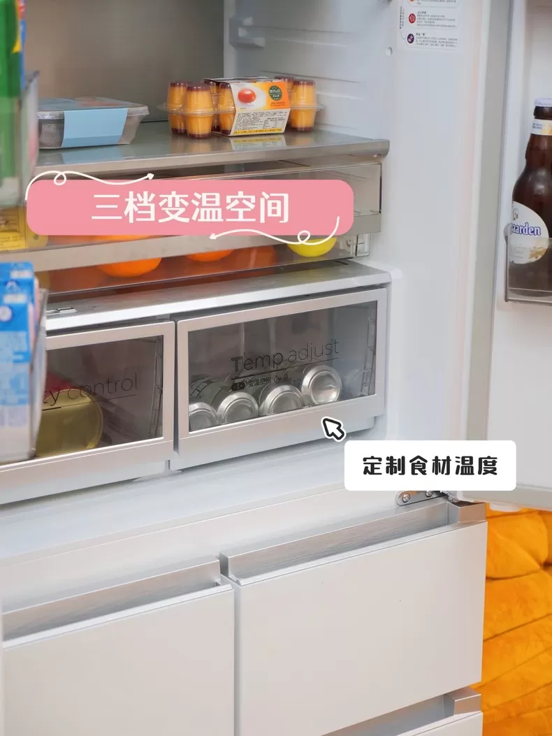 三档变温空间,定制食材温度这款美的424L四门超薄冰箱BCD-424WFPZM(E)还有可供三档调节的变温空间,4℃母婴 档、0℃冰饮 档一级-4℃肉类 软冻档。我家经常在天气热的时候,调到0℃冰饮档放满啤酒,晚上做几个小菜,拿 出冰啤、投影仪放上一场电影……宅家 也可以有快乐的小party 啦!