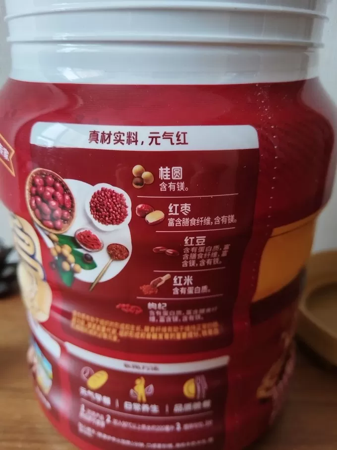 桂格5红混合即食燕麦片,里面有红豆、红枣、枸杞、桂圆和红米这五种红色食材,都是滋补气血的好东西。