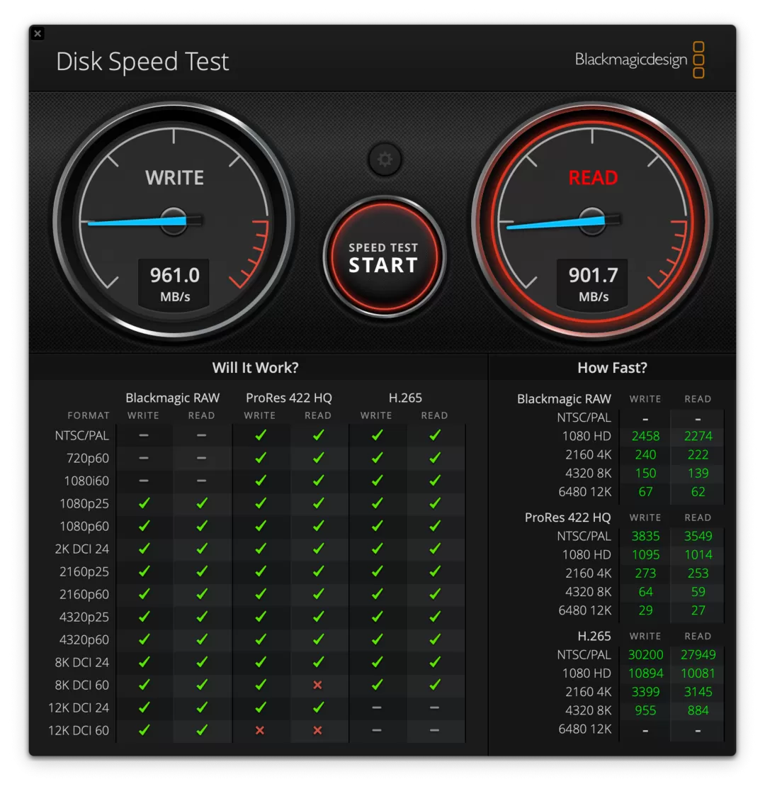 在Disk Speed Test的测试中,顺序读取速度为901MB/s,写入速度则为961MB/s。对于移动存储和日常数据备份等场景,USB3.2接口依然能够提供非常不错的传输体验。特别是在需要快速拷贝大量视频文件或照片时,这样的传输速度足够高效,减少了等待时间。