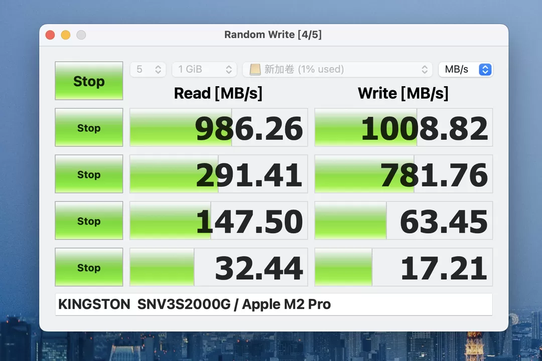 在使用绿联NVMe硬盘盒搭配USB3.2接口进行测试时,金士顿NV3的表现依然可圈可点。顺序读取速度达到986MB/s,顺序写入速度约为1008MB/s,速度表现非常接近USB3.2接口的理论上限。