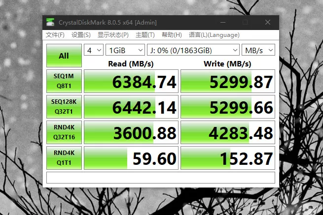 我们使用CrystalDiskMark来测试硬盘的顺序读取和写入速度。在测试中,金士顿NV3的顺序读取速度达到了6384MB/s,而顺序写入速度则为5299MB/s,这与其标称的性能非常接近,表现非常不错。
