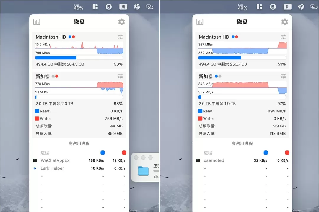 在日常使用中,金士顿NV3固态硬盘通过USB Type-C 3.2硬盘盒在MacOS平台下的文件传输表现也很值得一提。在实际的测试中,向硬盘写入文件时速度达到了756MB/s,而读取速度则达到了895MB/s。这些数据表现非常稳定,适合日常文件传输、备份以及处理较大文件(如高清视频、照片或设计文件)等操作。