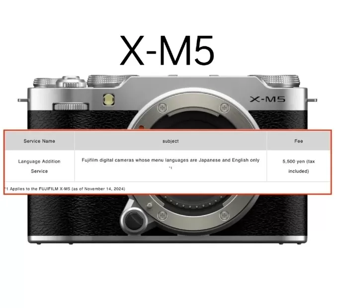 据FR爆料,富士X-M5相机日本在售版提供机身额外的系统语言增加服务,只需支付35美元的服务费便可在只有内置日语和英语菜单的富士xm5机身里植入中文操作系统,“划重点”这35美元约合250元人民币哈