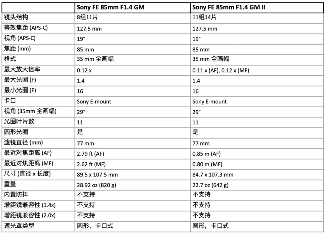 新款FE 85mm F1.4 GM II重点提升了镜头的便携性和对焦性能,这也是索尼FE镜头最近几年一直在做的升级。相比上一代,新款85GM2还有哪些变化呢?