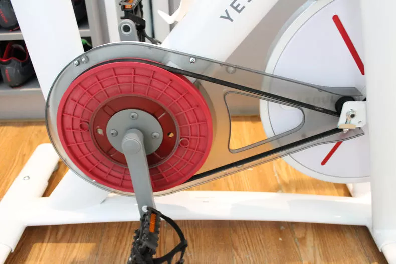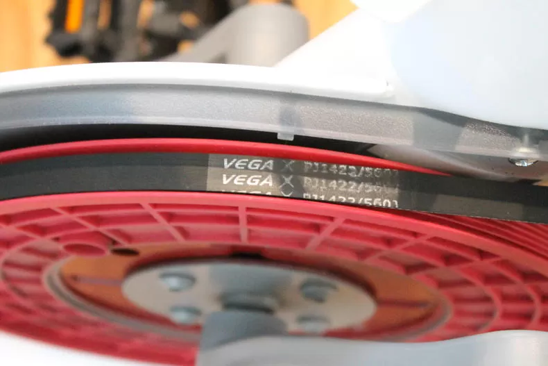 打开护盖,发现了这款动感单车的传送带并没有使用链条传动,而是采用了威格尔高强度静音皮带传送,这也是在较高端的产品上才使用的材质,这样可以保证运动时更加静音,并且不容易断裂。