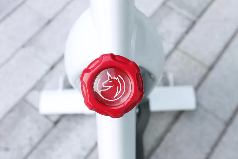 车架上方有一个阻力调节旋钮,通过向左或向右不同方向的旋转来进行阻力调节。此外,将旋钮用力下压,还有着紧急刹车的功能。