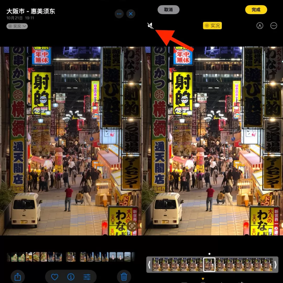 很多人可能不知道,虽然叫做“实况照片”。但是它也在保存动态内容的同时记录的现场的声音。因此有的时候发布live图朋友圈或者小红书的时候就要多注意了,如果不想要让声音也出现在照片的话,可以点击实况照片下方的照片编辑按钮,然后在编辑页面左上角将“小喇叭”禁用掉,这样你发出的照片就不会有声音的内容啦。